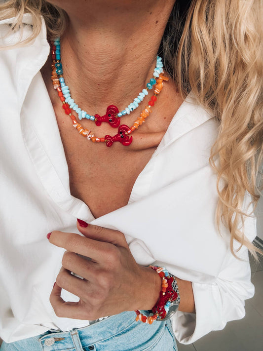Semiprecious filntisi chips in turquoise with glass lobster: Turquoise