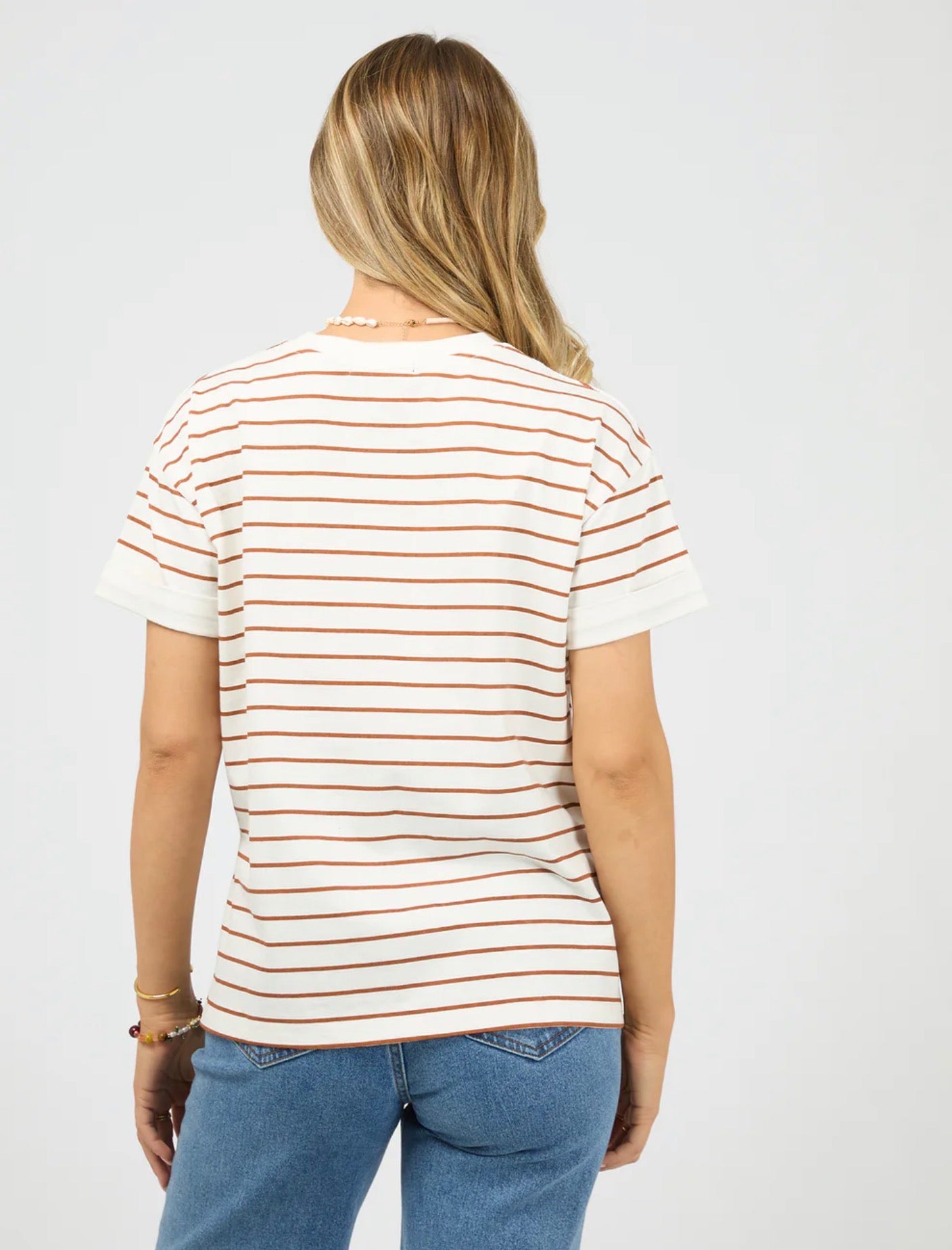 All About Eve Washed Stripe Tee features a garment wash with a branded chest embroidery. Styled back with denim jeans and sneakers for a chic weekend vibe.