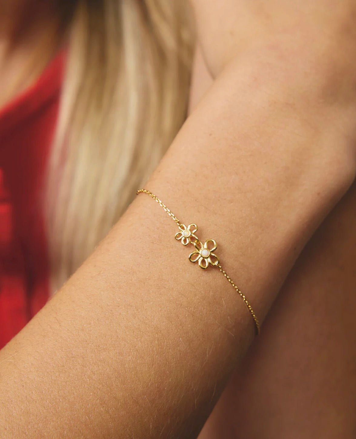The Annie Bracelet features a fine gold chain with a flower charm set with opal crystals, adding a gentle, elegant touch to any outfit.