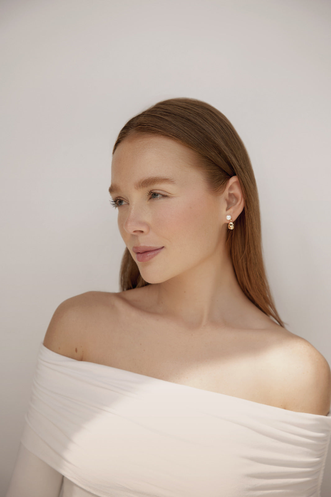 Pearl Stud Earrings with a twist Ð featuring a delicate hanging gold molten-look charm. Perfect for elevating any outfit, whether it's a casual day out or a special occasion. * Small and lightweight * One size * Stainless Steel * Artificial pearl bead studs