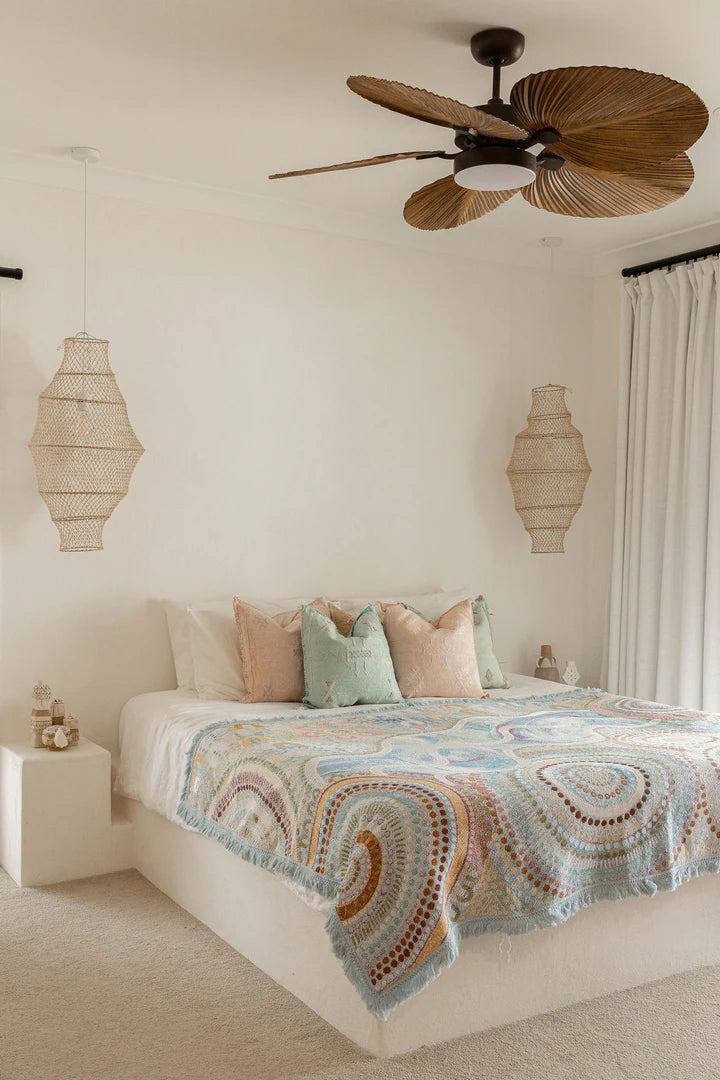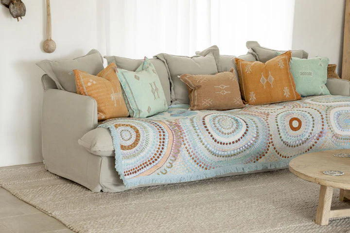 There’s so many uses for these stunning throws ~ They can be used as a picnic rug down the beach or park for the whole family to sit on, as a bed throw for extra warmth or to decorate or change the colour way of your bed, a lounge throw to add texture, vibrancy or warmth, a beach towel to dry yourself with after a swim in the ocean, a blanket to snuggle up in around a fire or to watch a movie, a wall hanger to display as beautiful Indigenous tapestry & more.