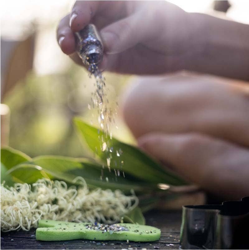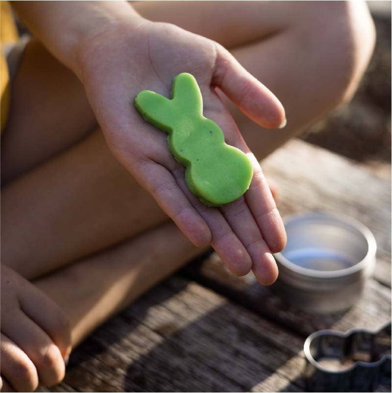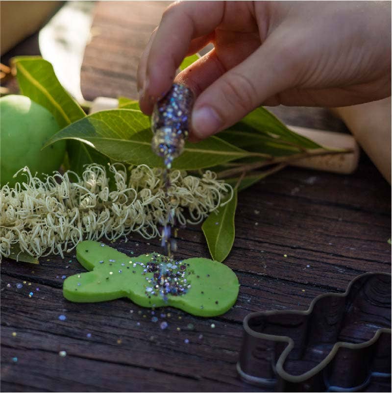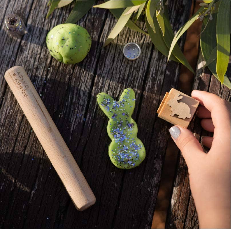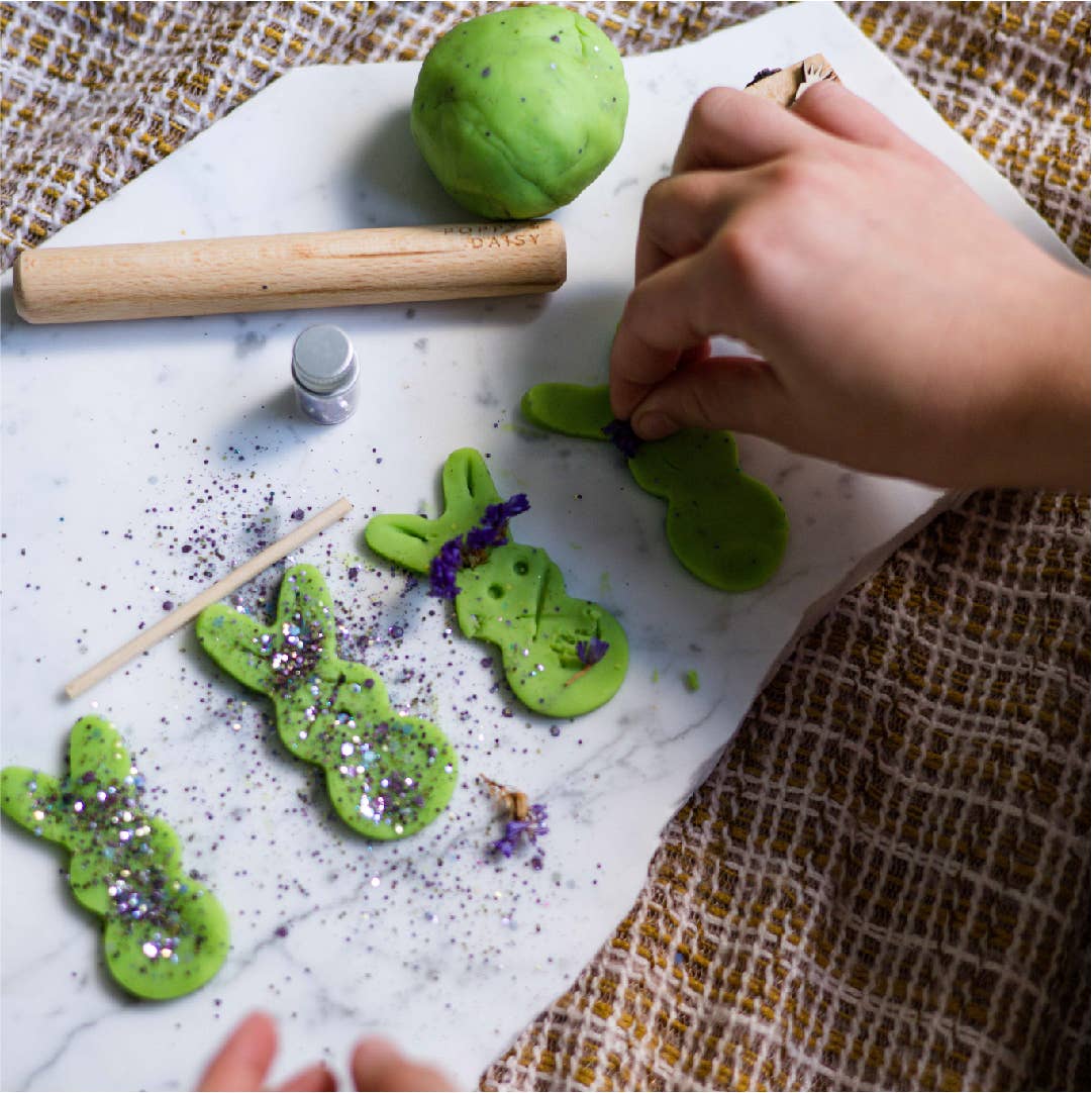 Roll out the dough to make Easter bunny cut outs, stamp and imprint fun shapes and sprinkle with bio-glitter.
