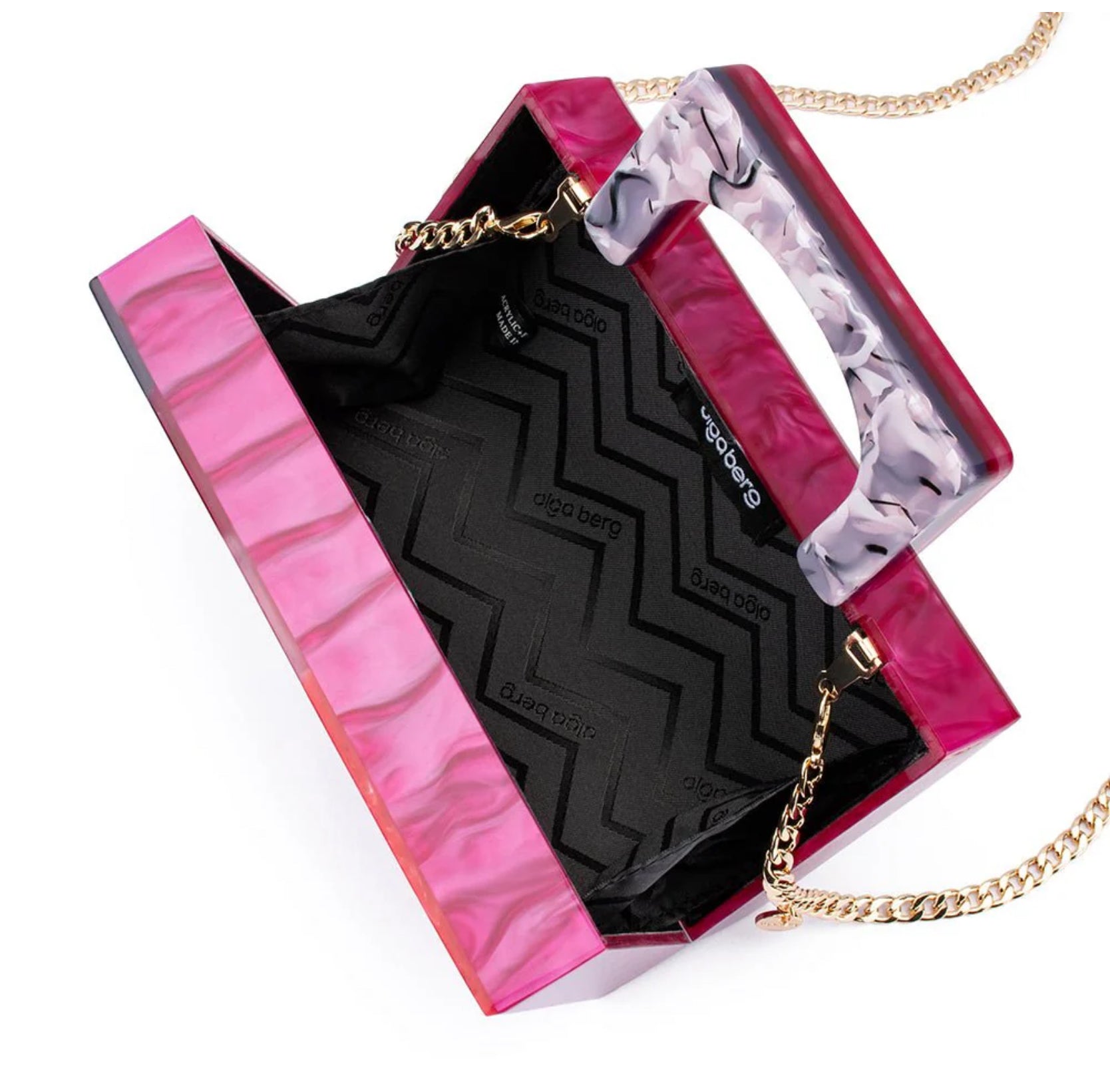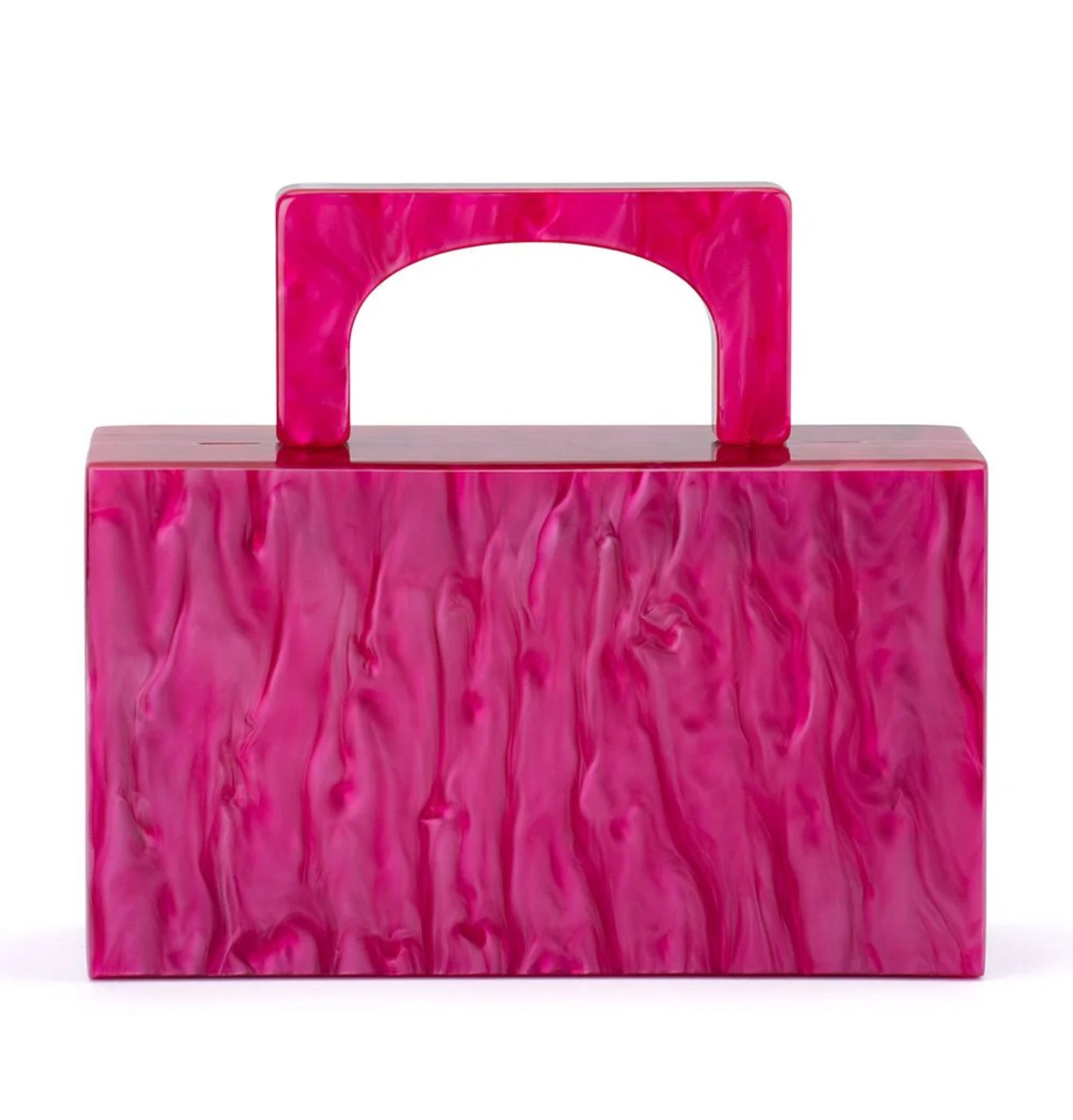 The adorable FLEUR Acrylic Top Handle bag features a jigsaw of tonal pattern acrylic pieces on the front face of this show stopping hard body clutch, which features a matching acrylic top handle for easy carrying, as well as plenty of space inside to store all your on-the-go necessities.