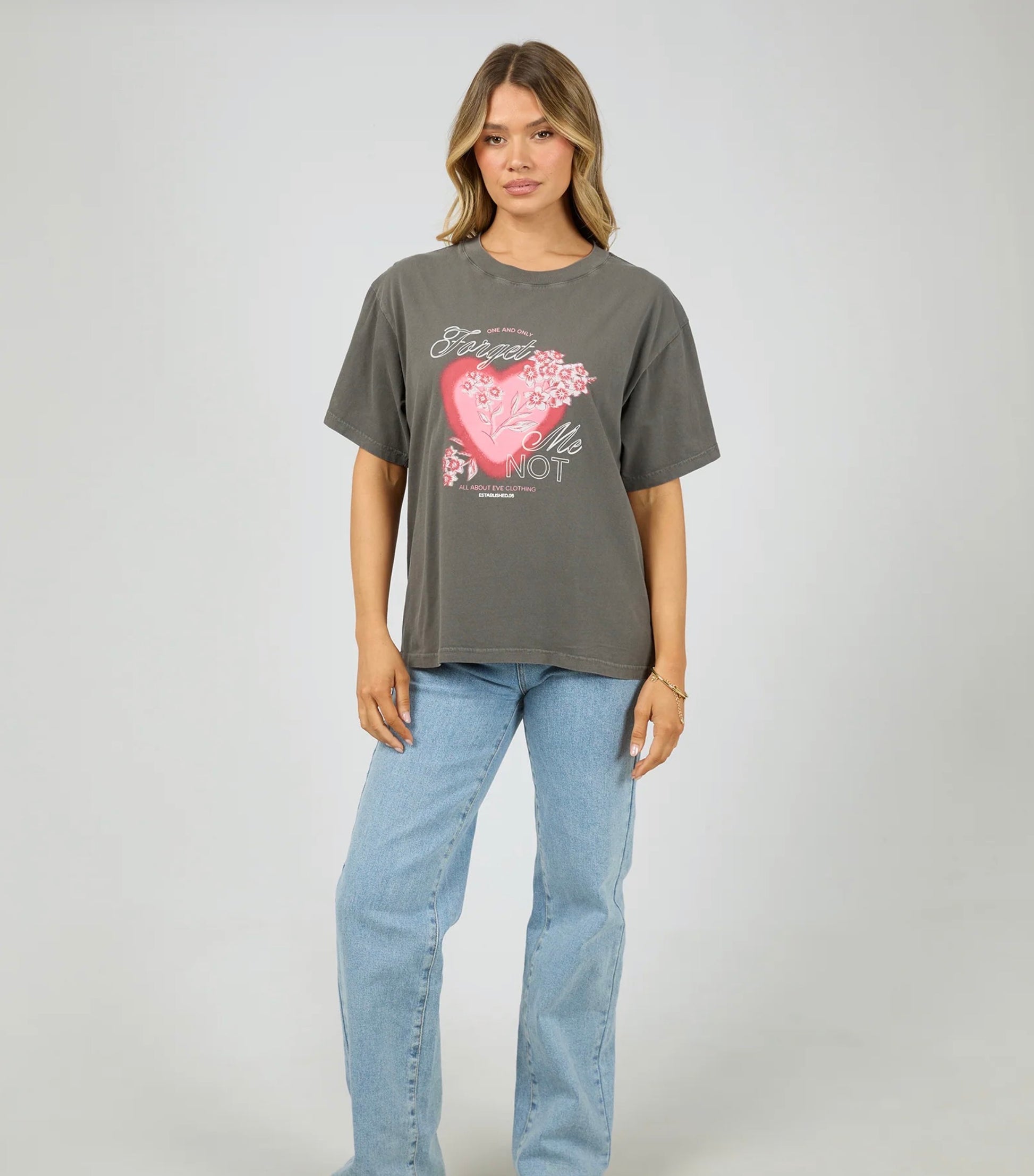 The Forget Me Not Box Tee in Charcoal adds a playful, nostalgic style to casual outfitting. Crafted from cotton jersey, it offers a soft, breathable feel with the perfect balance of structure and ease. Designed in a relaxed boxy fit, this tee features a crew neckline, dropped shoulders, and a vintage wash that creates a lived-in look and feel. The All About Eve exclusive graphic across the front lends a statement finish with feminine charm.