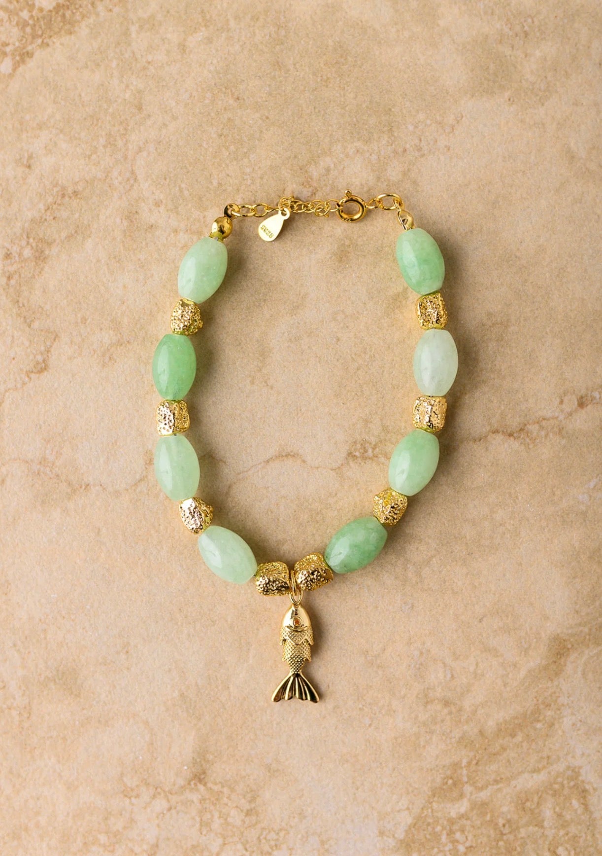 Stack with meaning in our GOIA Bracelet. Adorned with natural green jade stones, a dainty sardine charm, and 18kt crushed gold filled beads, this piece brings a playful, sun-soaked spirit to your everyday style.