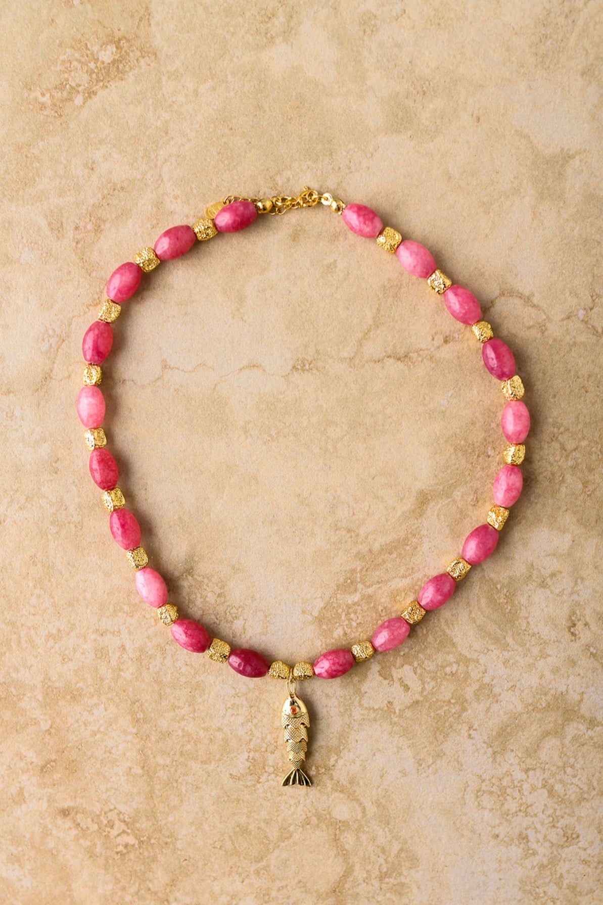 Invite joy and gentle energy with our GOIA Necklace. Designed with natural pink jade stones, a charming sardine pendant, and 18Kt crushed gold filled beads, this piece blends coastal playfulness with elegant femininity.