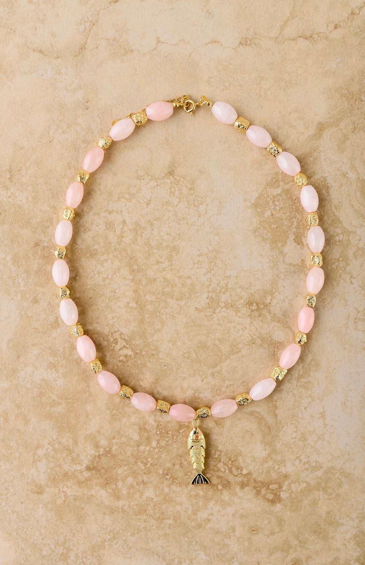 Radiate soft strength with our GOIA Necklace. Featuring natural rose quartz stones and 18Kt crushed gold filled beads, this feminine piece is a gentle reminder to lead with love and intention.