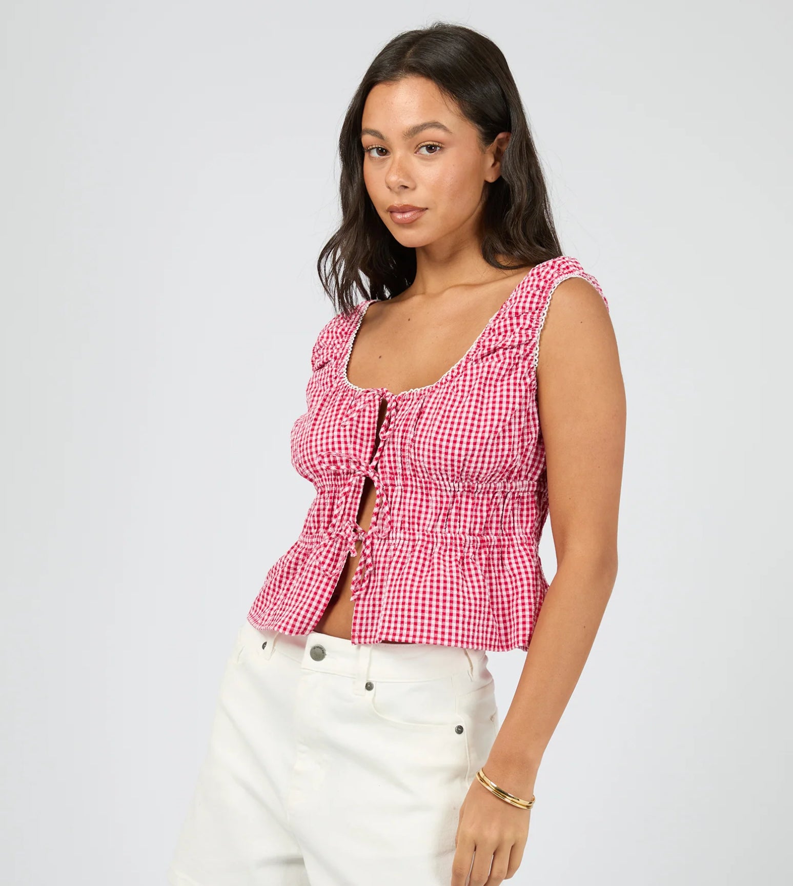 The Lani Tie Top blends feminine detailing with relaxed ease, crafted in pure cotton check. Designed with gathered straps and sleeves, it features delicate scalloped lace around the neck and armholes. The bodice has binding throughout for a refined finish, while functional ties at the centre front add adjustability and charm. Pair it back with your favourite denim and sandals for easy laid-back styling.