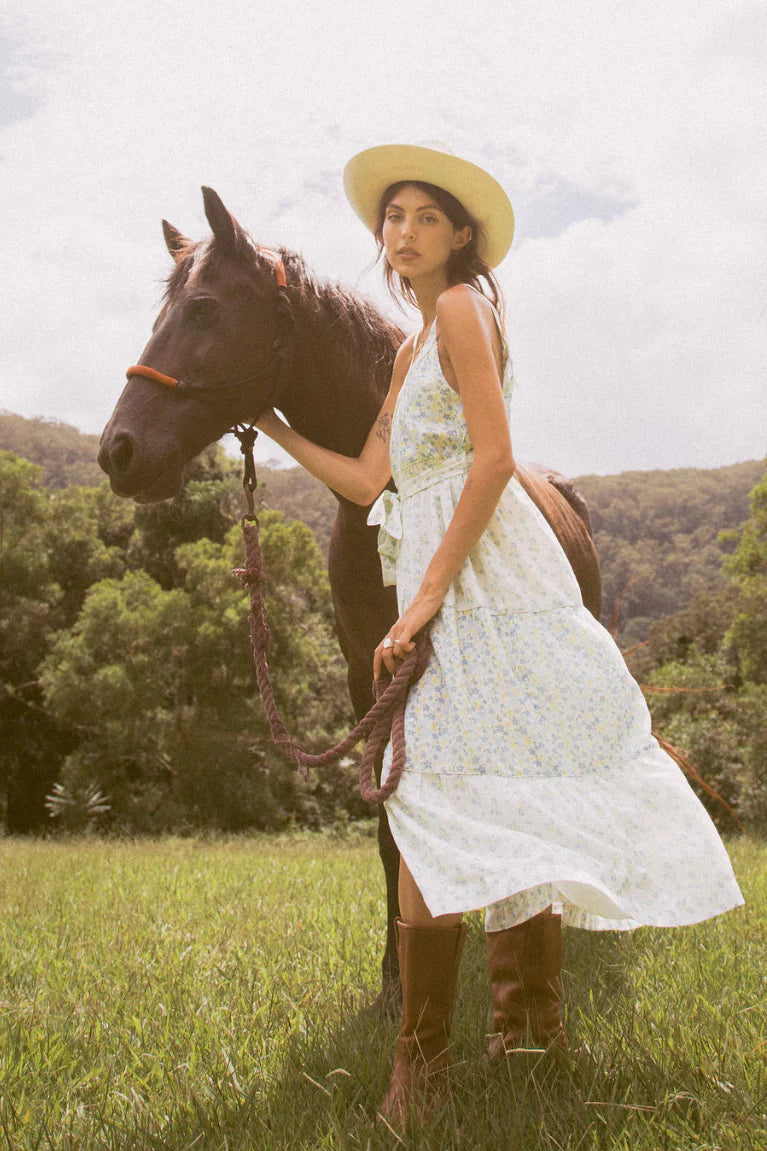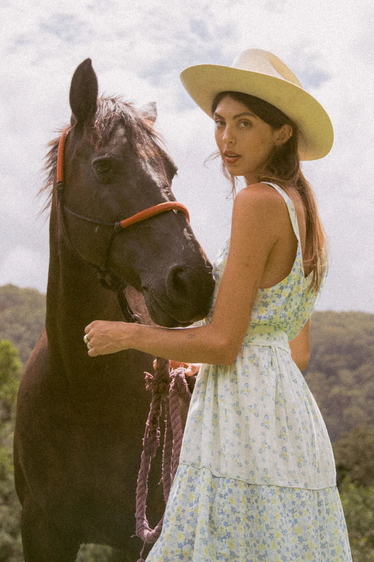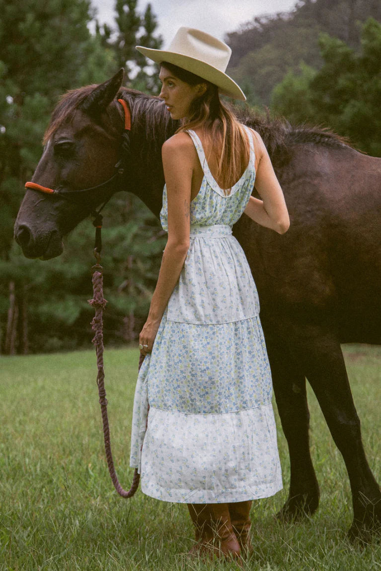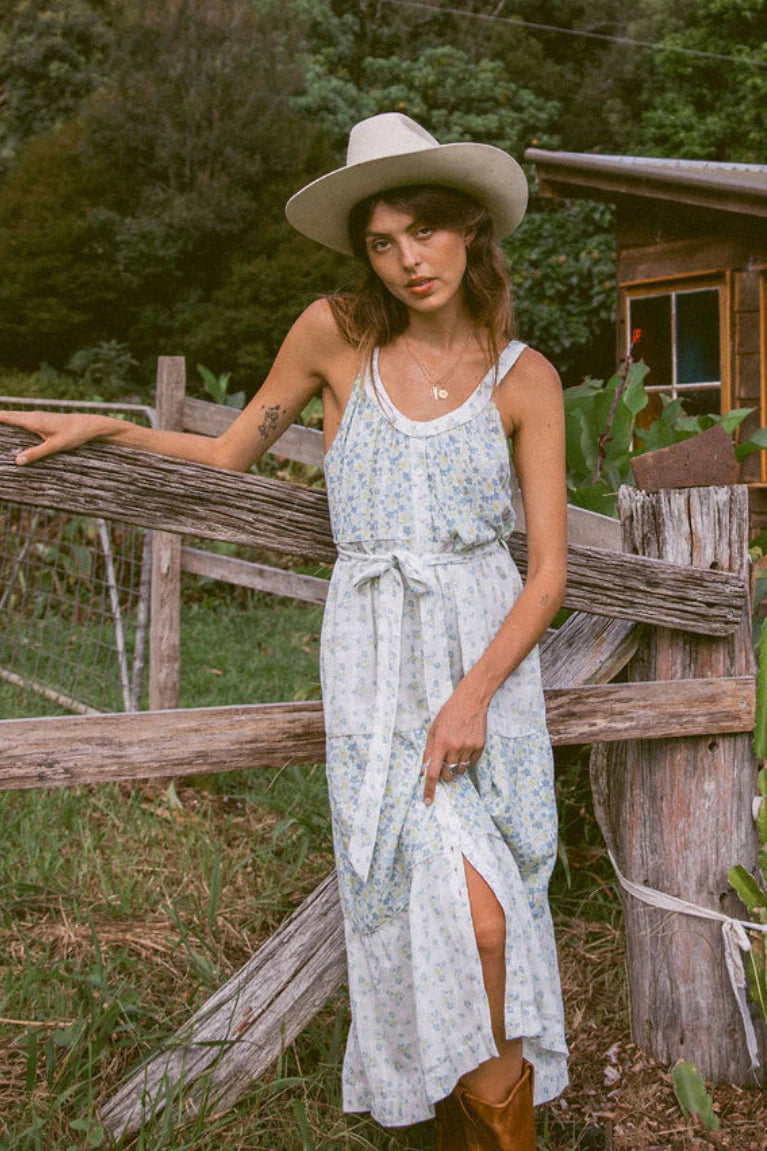 The Maeve Maxi Dress carries the same spirit of ease and femininity as her little sister, but with an added sweep of romance. Crafted in cotton and patterned with two variations of our in-house hand-drawn ditsy florals in soft powder blue, she feels both nostalgic and refreshingly modern. A gathered, tiered skirt cascades to the ankle, moving with a graceful sway, while buttons run the full length of the front — a detail as practical as it is charming. The optional belt tie lets you cinch the waist for definition or wear her loose for an effortless drape. Designed for days that begin in sunlight and end under the stars, the Maeve Maxi is a study in timeless ease, with just the right touch of whimsy.