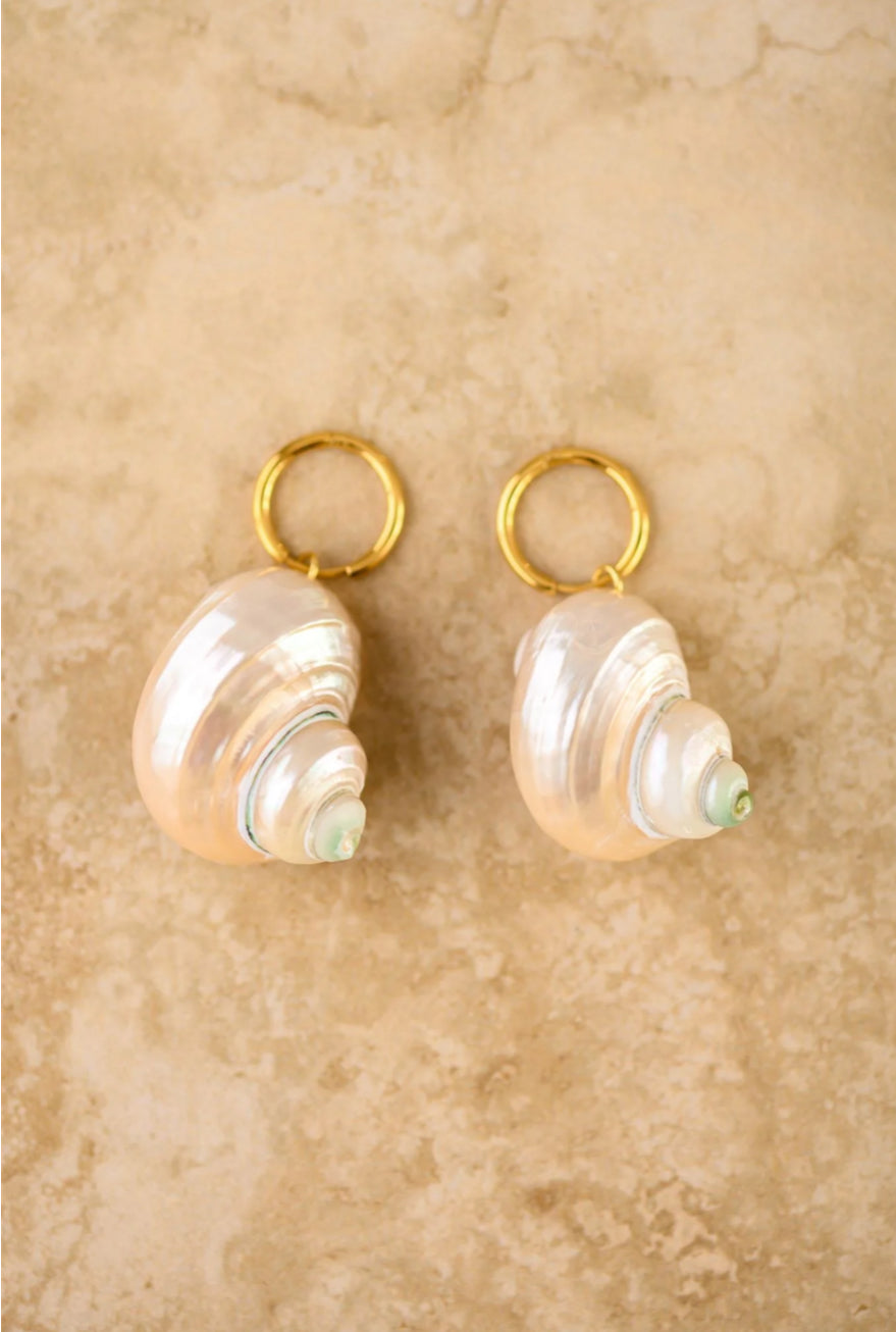 Oceanic elegance in every detail. The NAHLA Earrings feature natural conch shells suspended from timeless 18kt gold plated hoops — a beautiful blend of earthy texture and golden glow, perfect for effortless summer styling.