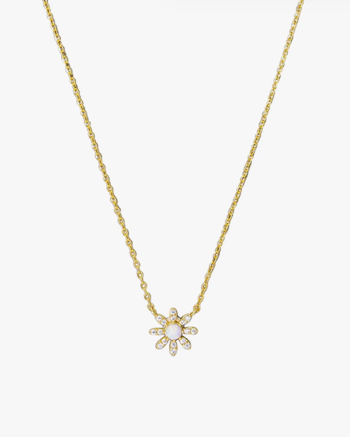 Elevate your jewellery collection with the Seema Necklace, featuring a delicate fine gold chain paired with a charming flower pendant. Accented by a luminous opal crystal, this piece offers a refined blend of elegance and subtle sparkle. Perfect for layering or wearing solo, it adds a sophisticated touch to any outfit with expert craftsmanship and timeless design.