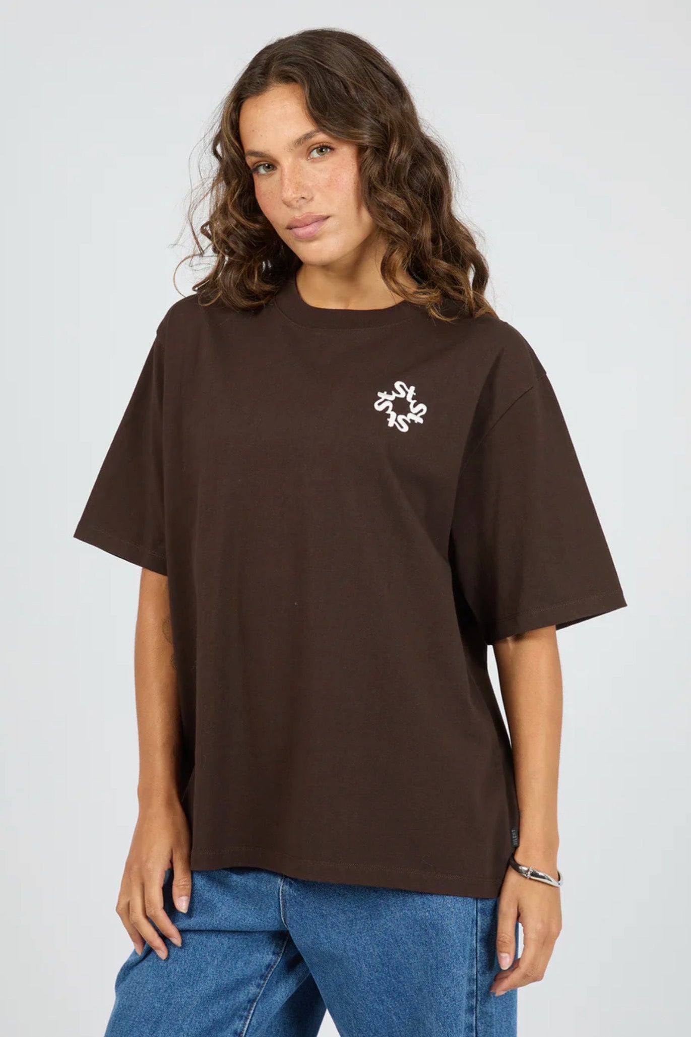 Love a chocolate base tee, look no further than our Sunrise Tee. Made from a heavy weight cotton jersey, this tee is our iconic core oversized tee fit and features a front embroidered hit with large multi application back print. Pair back with our Jade Baggy jean for the easiest on the go look.