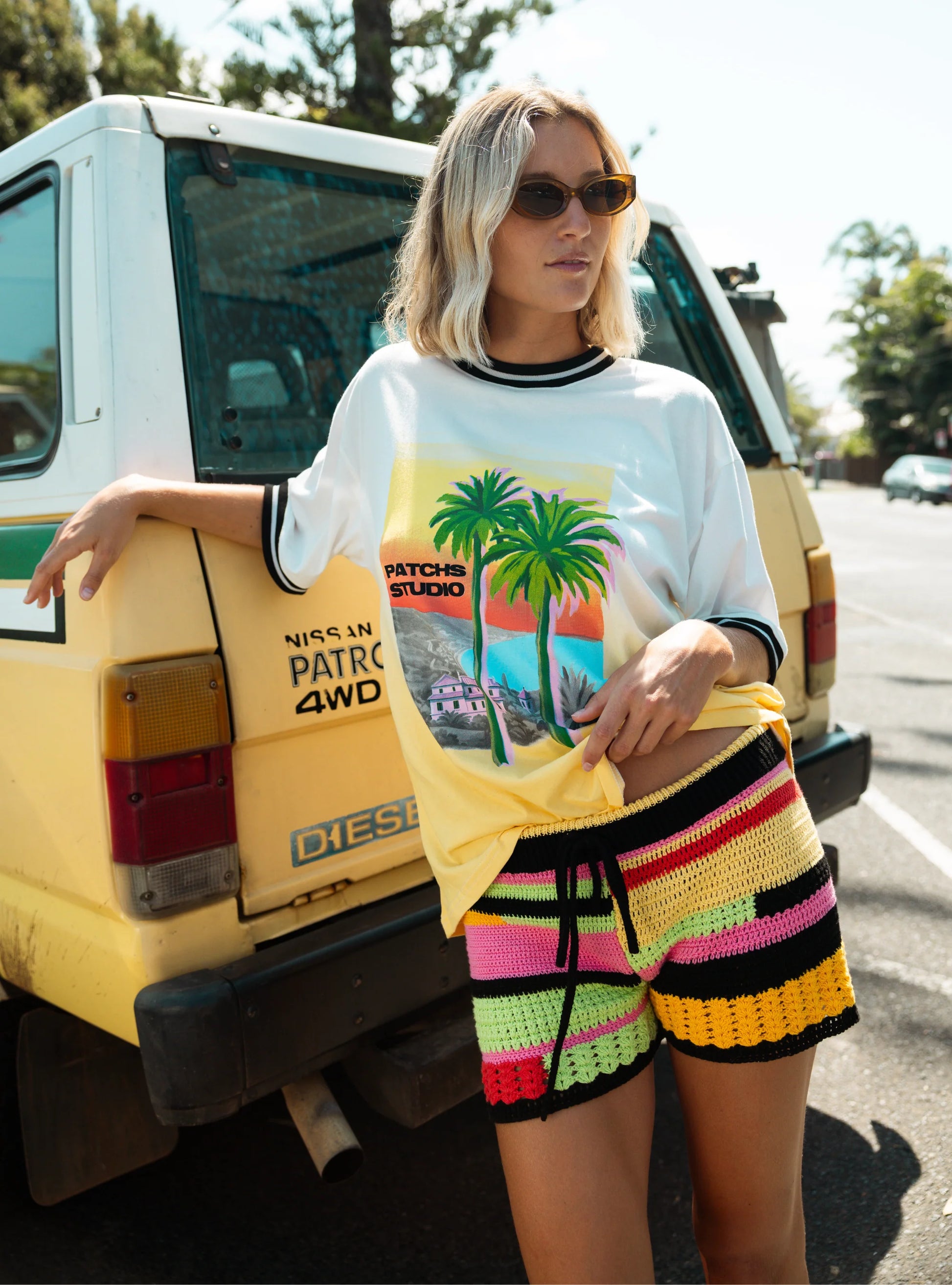 The Tropical Tee features a vibrant yellow summer gradient and a unique front print inspired by sun-soaked Sicilian days. Designed with a bold black ribbed neck and matching cuffs, it’s handcrafted by skilled artisans using soft Peruvian cotton. This relaxed-fit tee blends artistic detail with effortless everyday comfort.