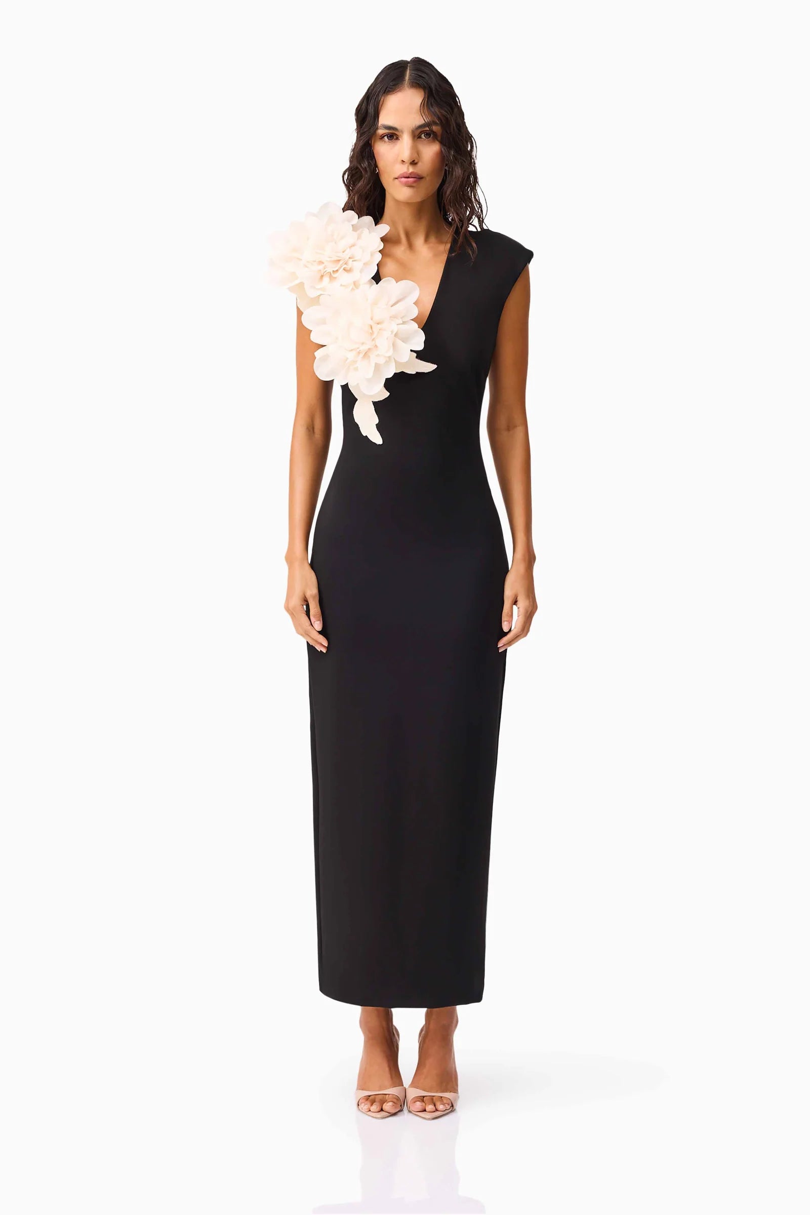The dramatic plunge V-neckline creates a striking silhouette, balanced by the artful contrast flower trim that adds texture and sophistication. Fully lined for a seamless fit, it fastens at the centre back with an invisible zipper, maintaining a smooth, sleek profile.